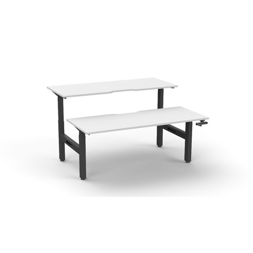 Rapidline Boost back to back 2 person manual crank height adjustable workstation. White top with black frame.