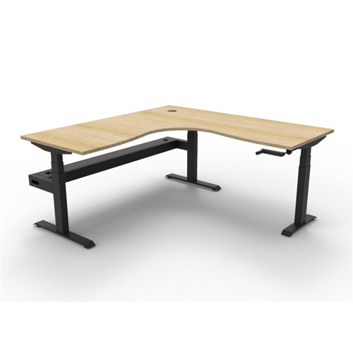 Rapidline Boost manual crank height adjustable corner workstation with cable tray. Natural oak top with black frame.