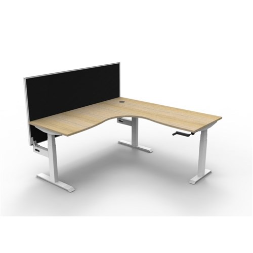 Rapidline Boost manual crank height adjustable corner workstation with screen. Natural oak top with white frame.