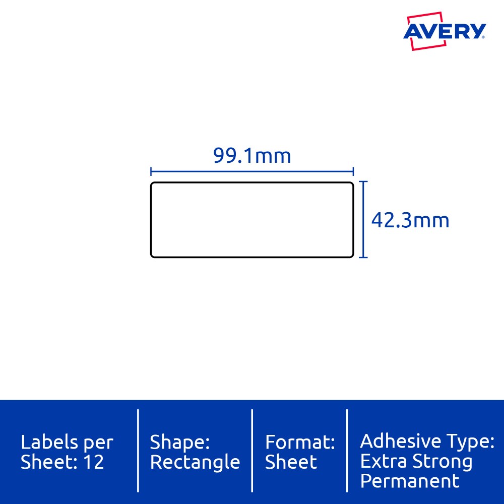 Size: 99.1x42.3mm 120 labels, 10 sheets. 12 labels per sheet (12UP).