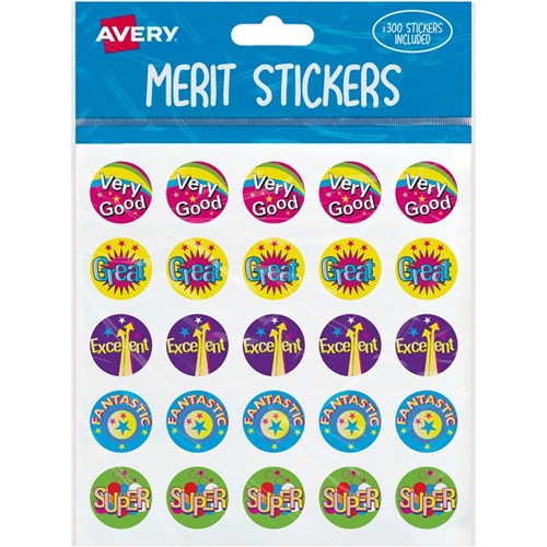 Avery Merit Stickers Caption 3 Round 22mm 5 Designs Assorted Colours 300 Stickers