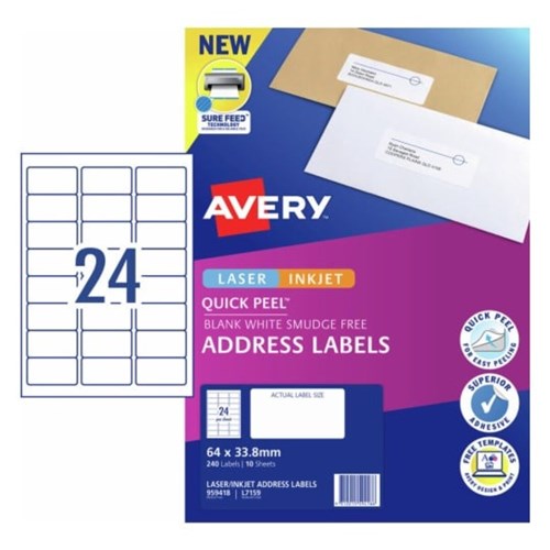 Avery Quick Peel Address Laser White L7159 64 x 33.8mm 24UP 2400 Labels 100 Sheets