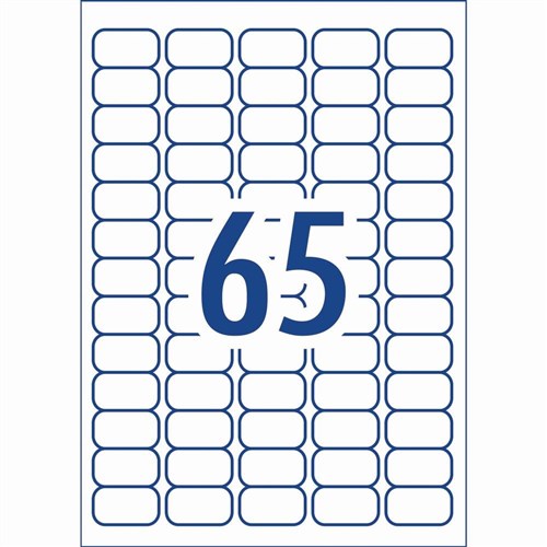 Size: 38.1x21.2mm 6500 labels, 100 sheets. 65 labels per sheet (65UP).