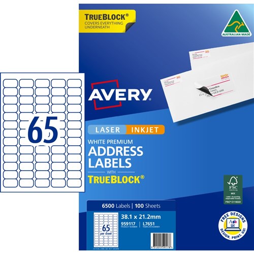 Avery Trueblock Address Labels Laser L7651 38.1 x 21.2mm 65UP 6500 Labels
