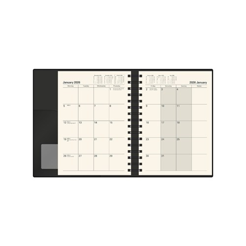 Pen loop, lay flat opening, ribbon marker and month to view layout.