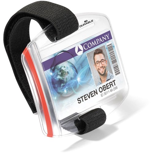 An adjustable arm strap with hook and loop fastening that can be used on outside of clothing for ease of walking around enables ID cards and passes to be securely fastened and highly visible at all times.