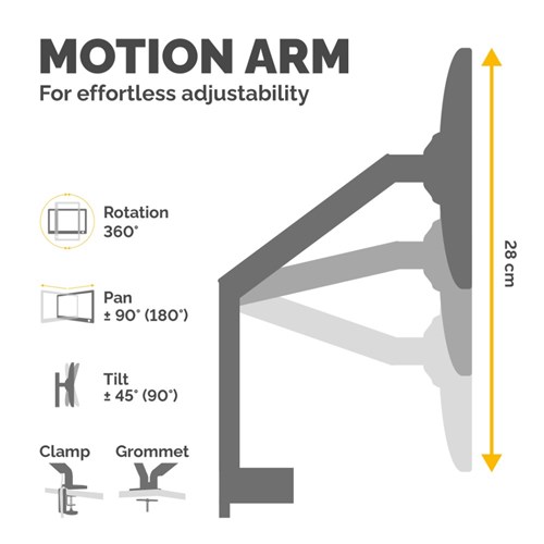 Fully independent adjustable monitor arms, with 360 degrees rotation via innovative gas spring technology allowing for effortless movement.