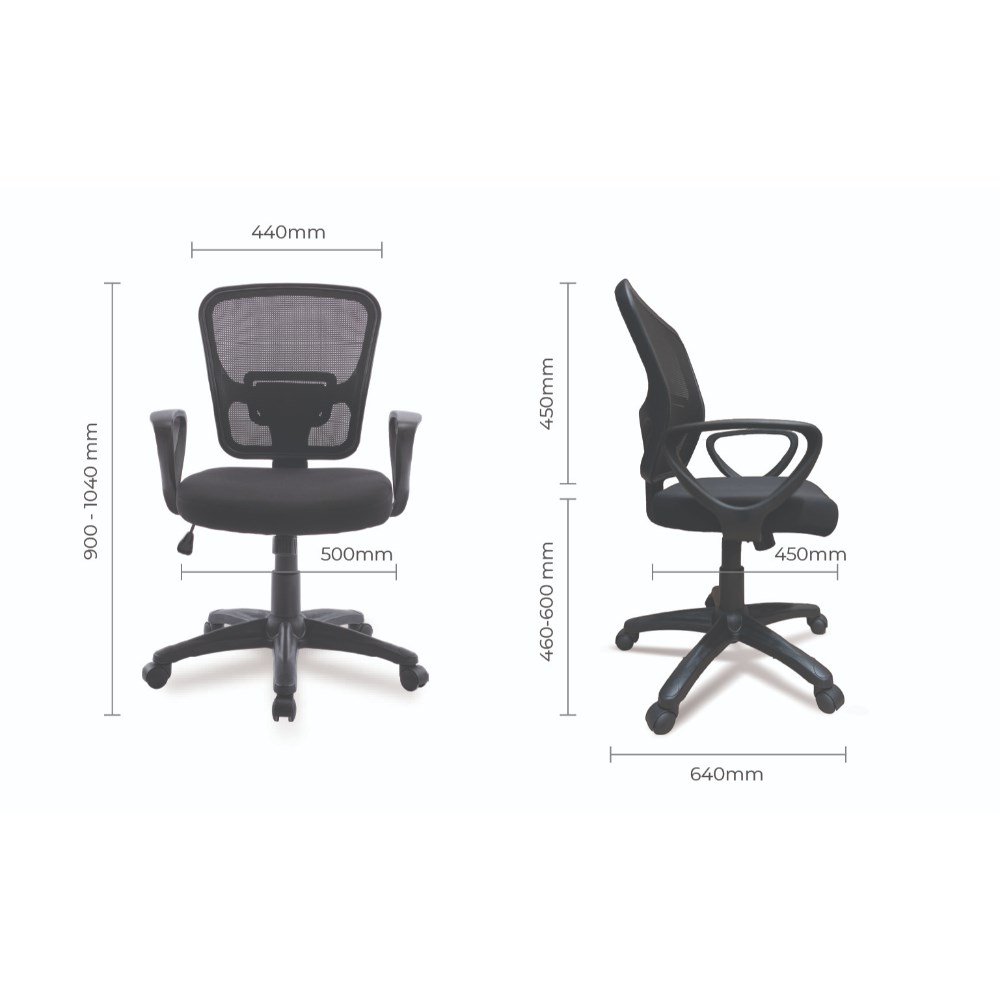Seat Dimensions: 500W x 450D x 460-600mmH. Back Height: 450mm. Back Width: 440mm. Floor to Arms: 640-730mm.