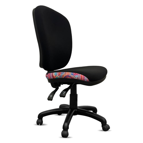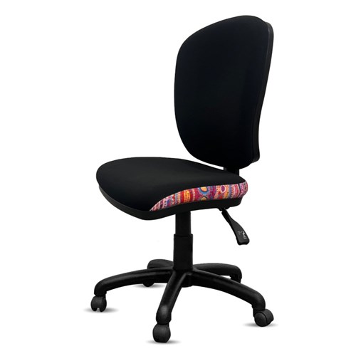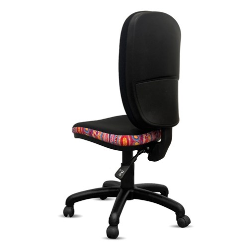 A unique commercial fabrics designed by Murdie Nampijinpa Morris (Indigenous Artist) combined with K2 Black Fabric to upholster the chair.