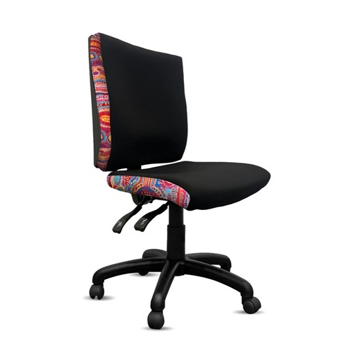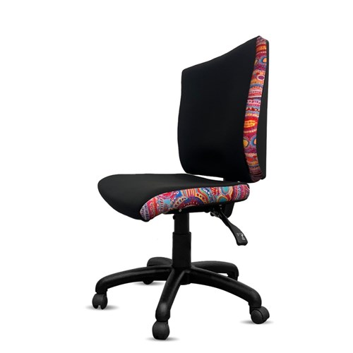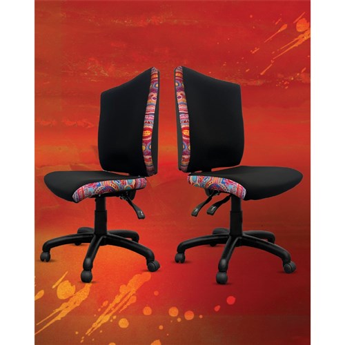 A unique commercial fabrics designed by Murdie Nampijinpa Morris (Indigenous Artist) combined with K2 Black Fabric to upholster the chair.