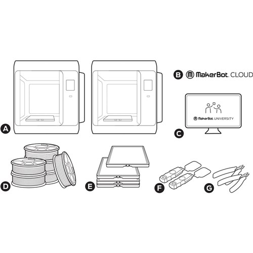 It includes 2 Sketch printers, 4 spools PLA, 2 starter spool Grey PLA, 4 build plates, 2 teacher and 10 student MakerBot certification program.