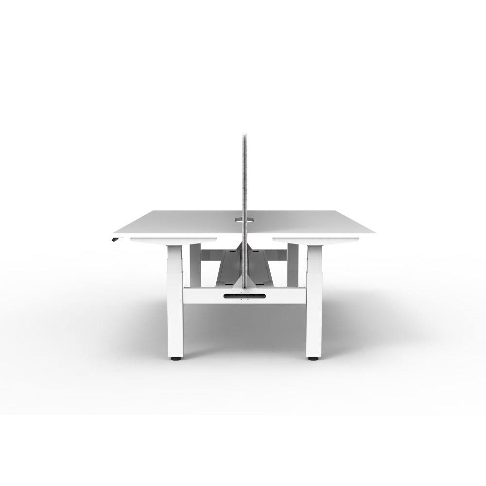 Natural white worksurface with rigid edging and 50mm scallop cable cut out. E0 rated 25mm top. White satin powder coat underframe. Eco screen and cable tray.