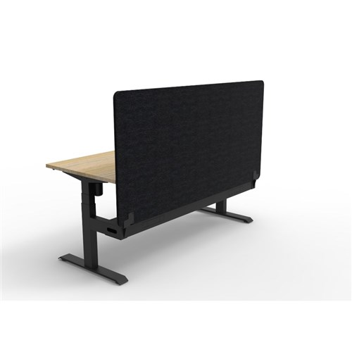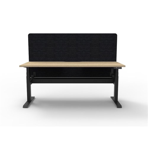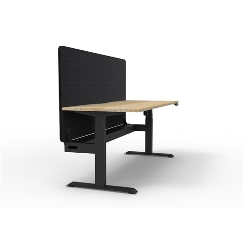Electric height adjustable single sided workstation with Natural Oak top and Black Satin frame, Black Eco screen and cable tray.