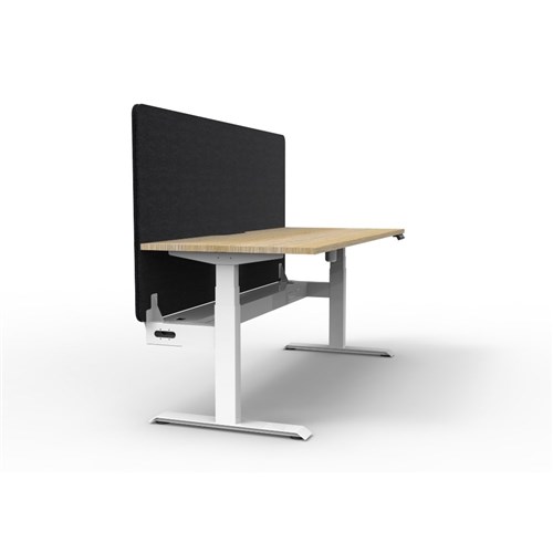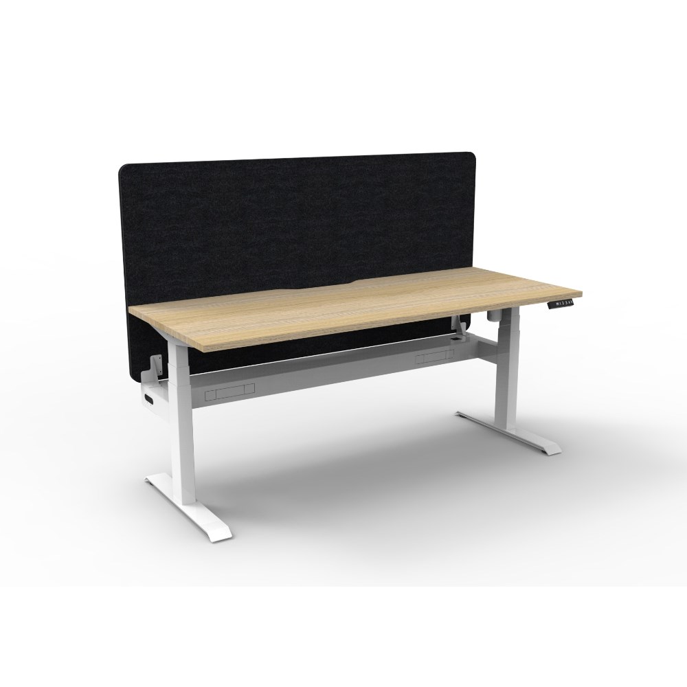 Electric height adjustable single sided workstation with Natural Oak top and White Satin frame, Black Eco screen and cable tray.