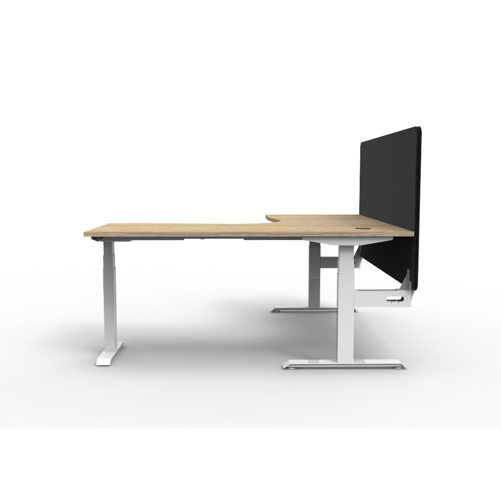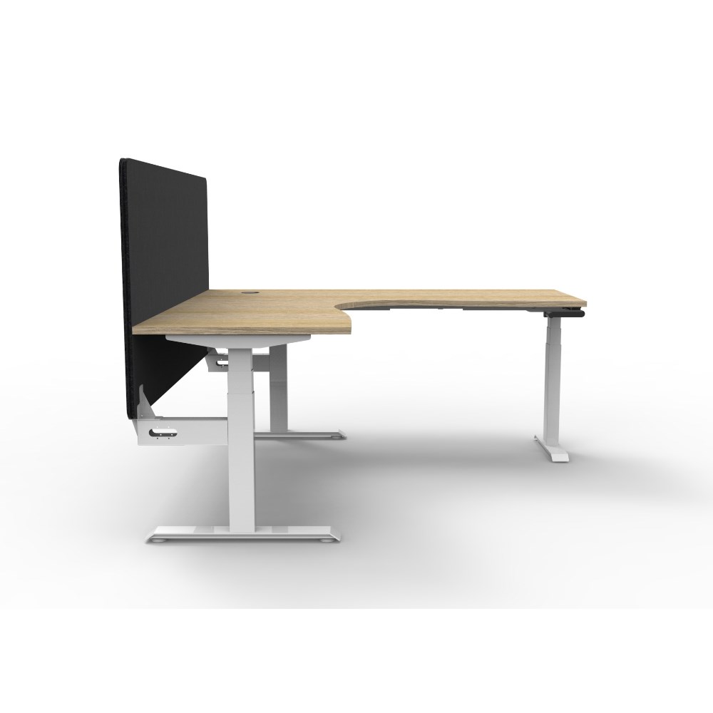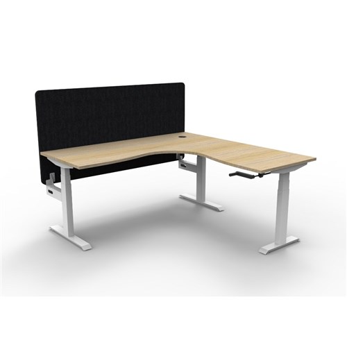 Manual crank height adjustable corner workstation with Natural Oak top and White Satin frame, Black Eco screen.
