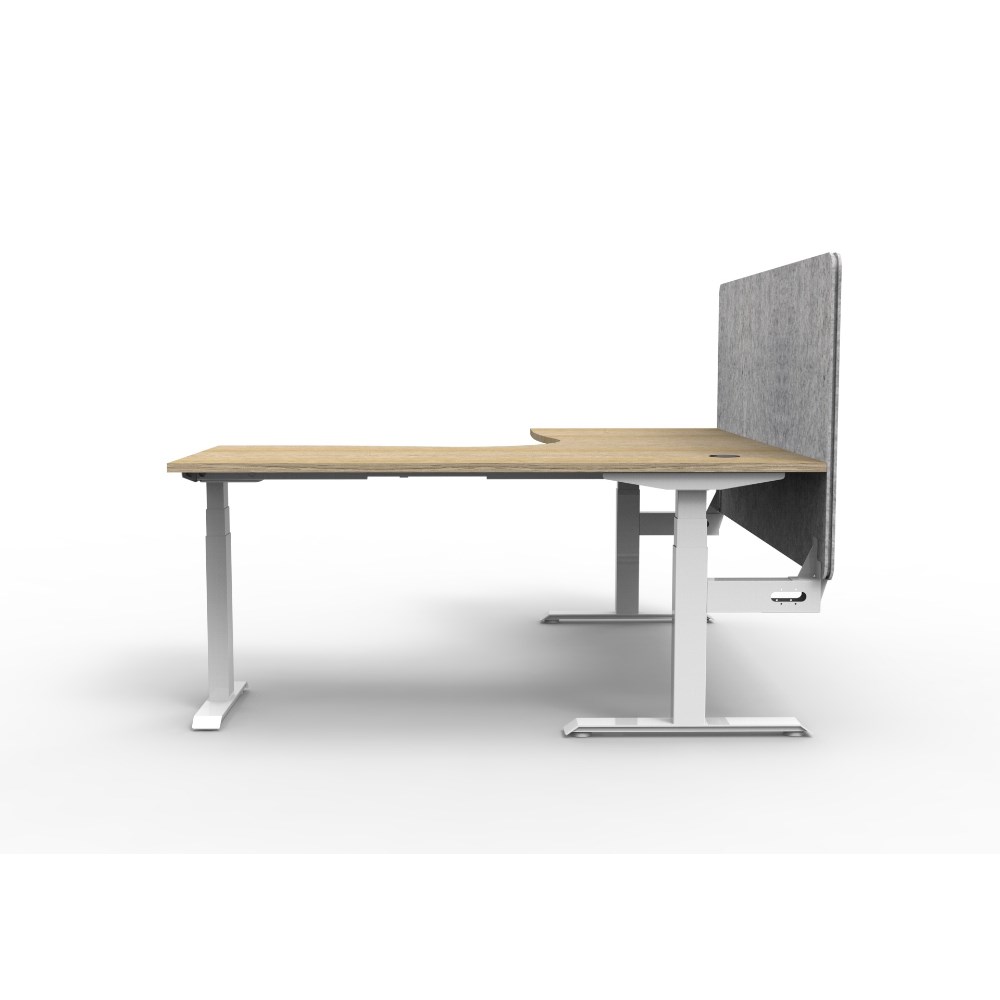 Manual crank height adjustable corner workstation with Natural Oak top and White Satin frame, Grey Eco screen.