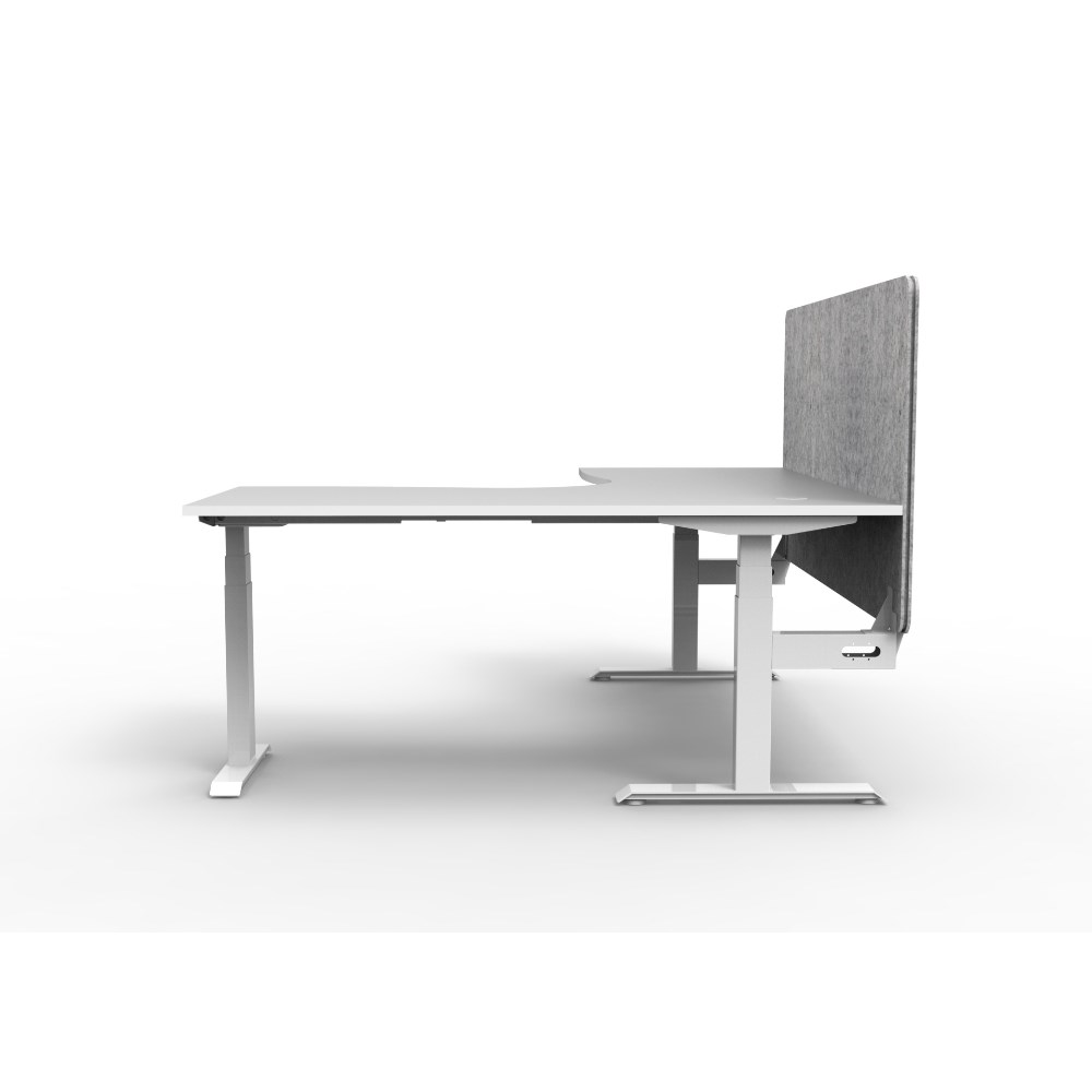 Manual crank height adjustable corner workstation with Natural White top and White Satin frame, Grey Eco screen.