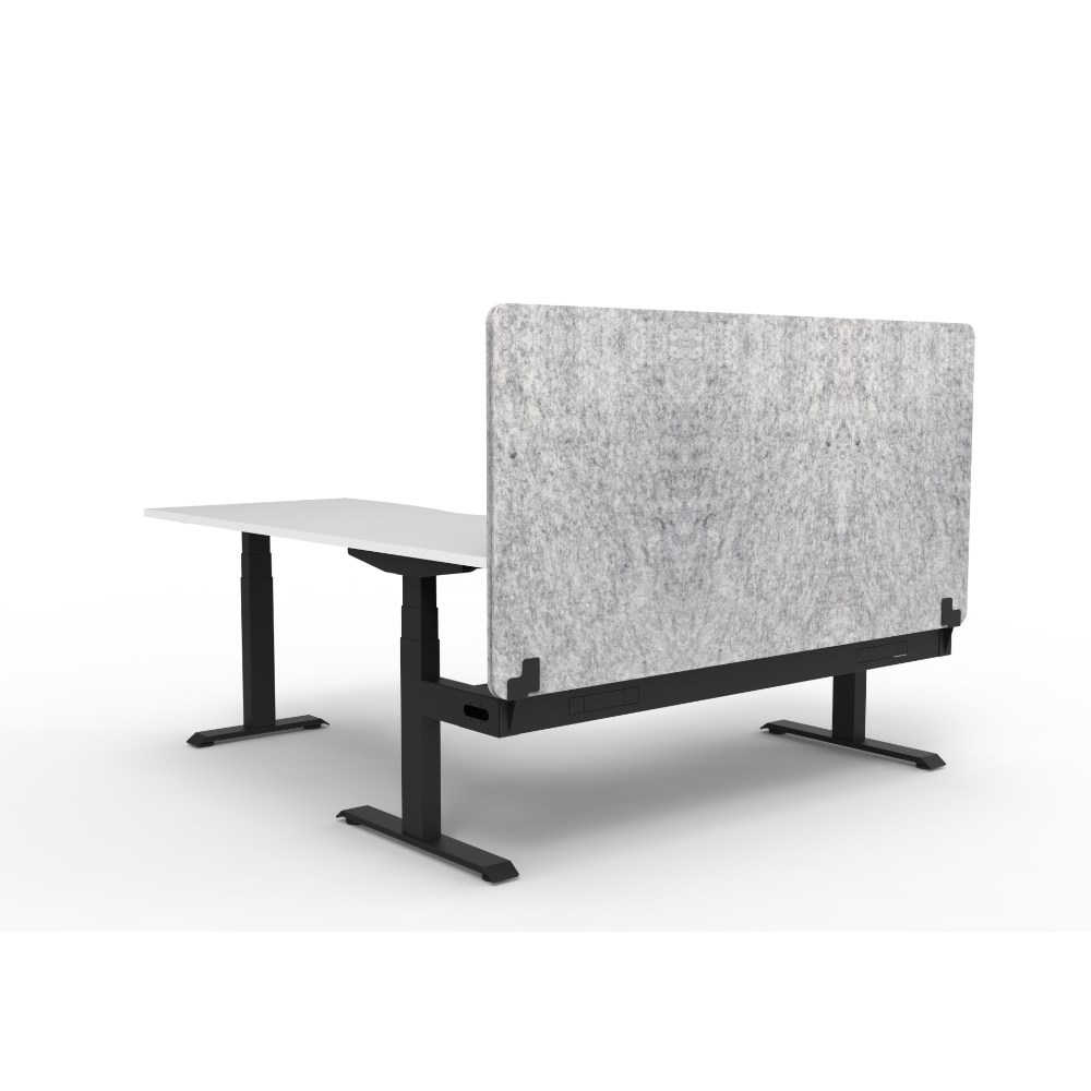 Manual crank height adjustable corner workstation with Natural White top and Black Satin frame, Grey Eco screen and cable tray.