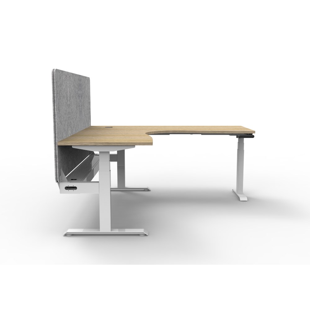 Manual crank height adjustable corner workstation with Natural Oak top and White Satin frame, Grey Eco screen and cable tray.