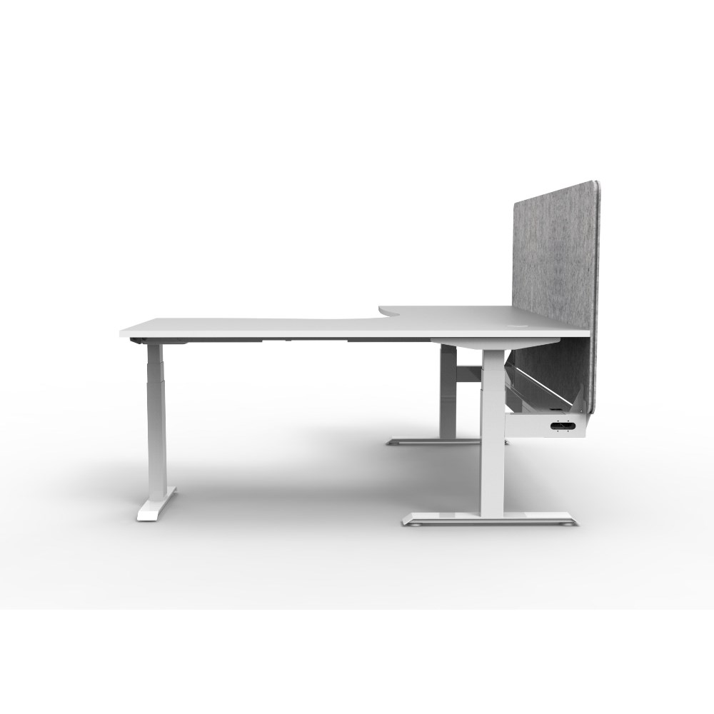 Manual crank height adjustable corner workstation with Natural White top and White Satin frame, Grey Eco screen and cable tray.