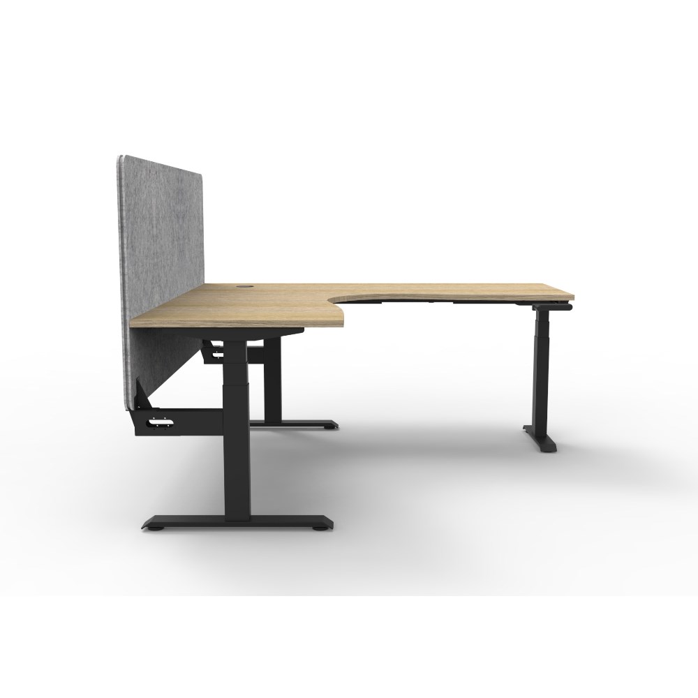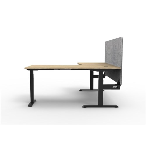 Manual crank height adjustable corner workstation with Natural Oak top and Black Satin frame, Grey Eco screen.