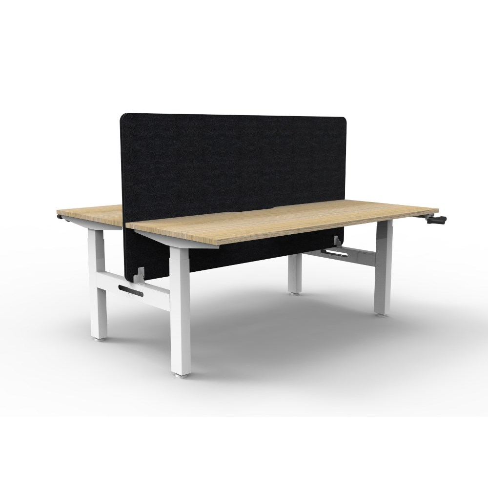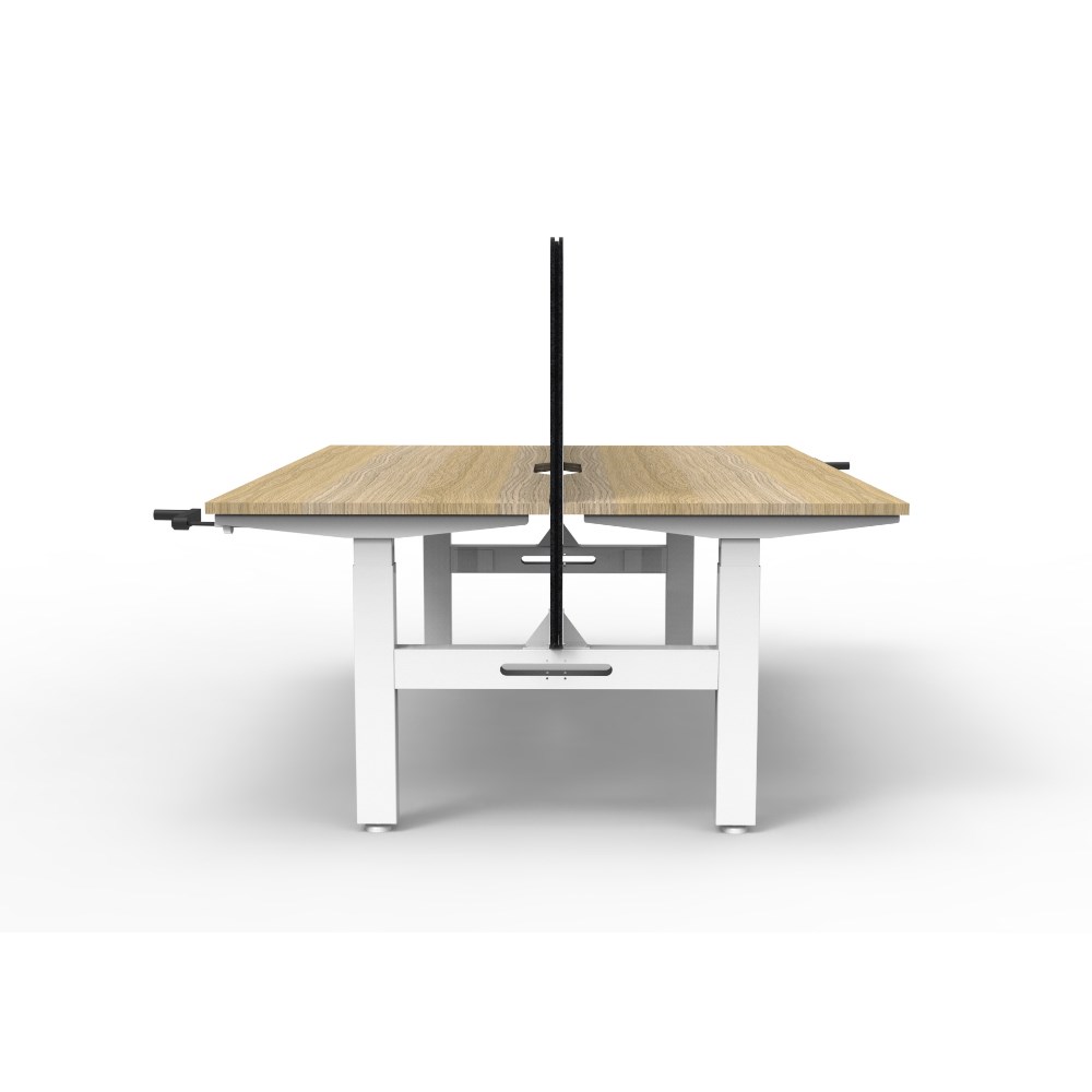 Manual crank height adjustable 2 person back to back workstation with Natural Oak top and White Satin frame, Black Eco screen.