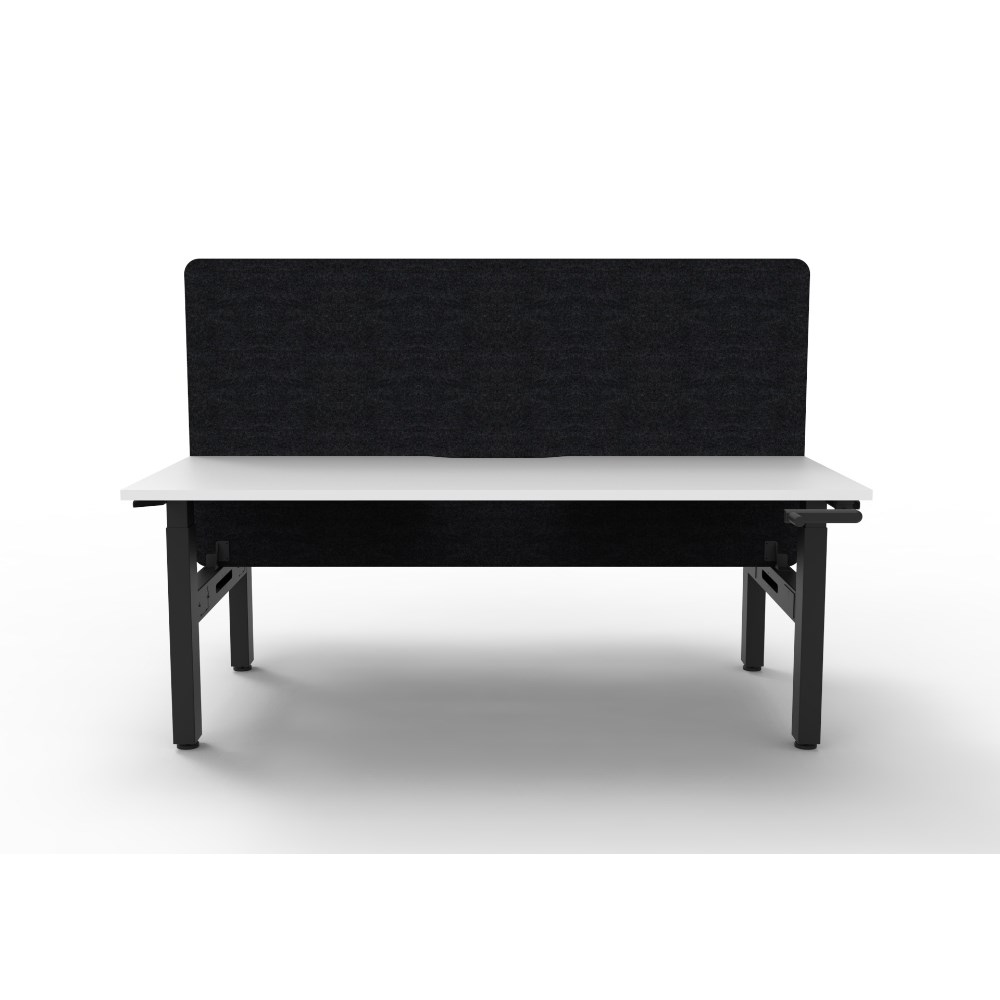 Manual crank height adjustable 2 person back to back workstation with Natural White top and Black Satin frame, Black Eco screen.
