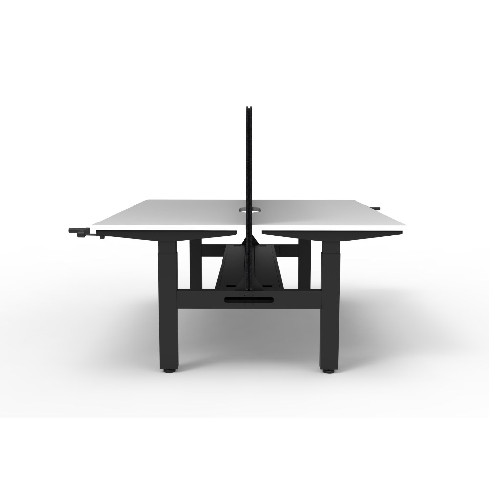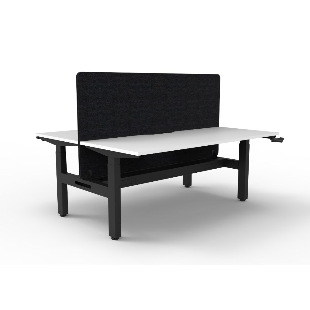 Manual crank height adjustable 2 person back to back workstation with Natural White top and Black Satin frame, Black Eco screen and cable tray.