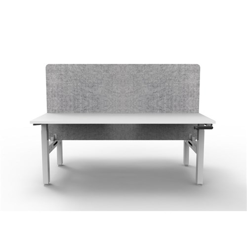 Manual crank height adjustable single sided workstation with Natural White top and White Satin frame, Grey Eco screen.