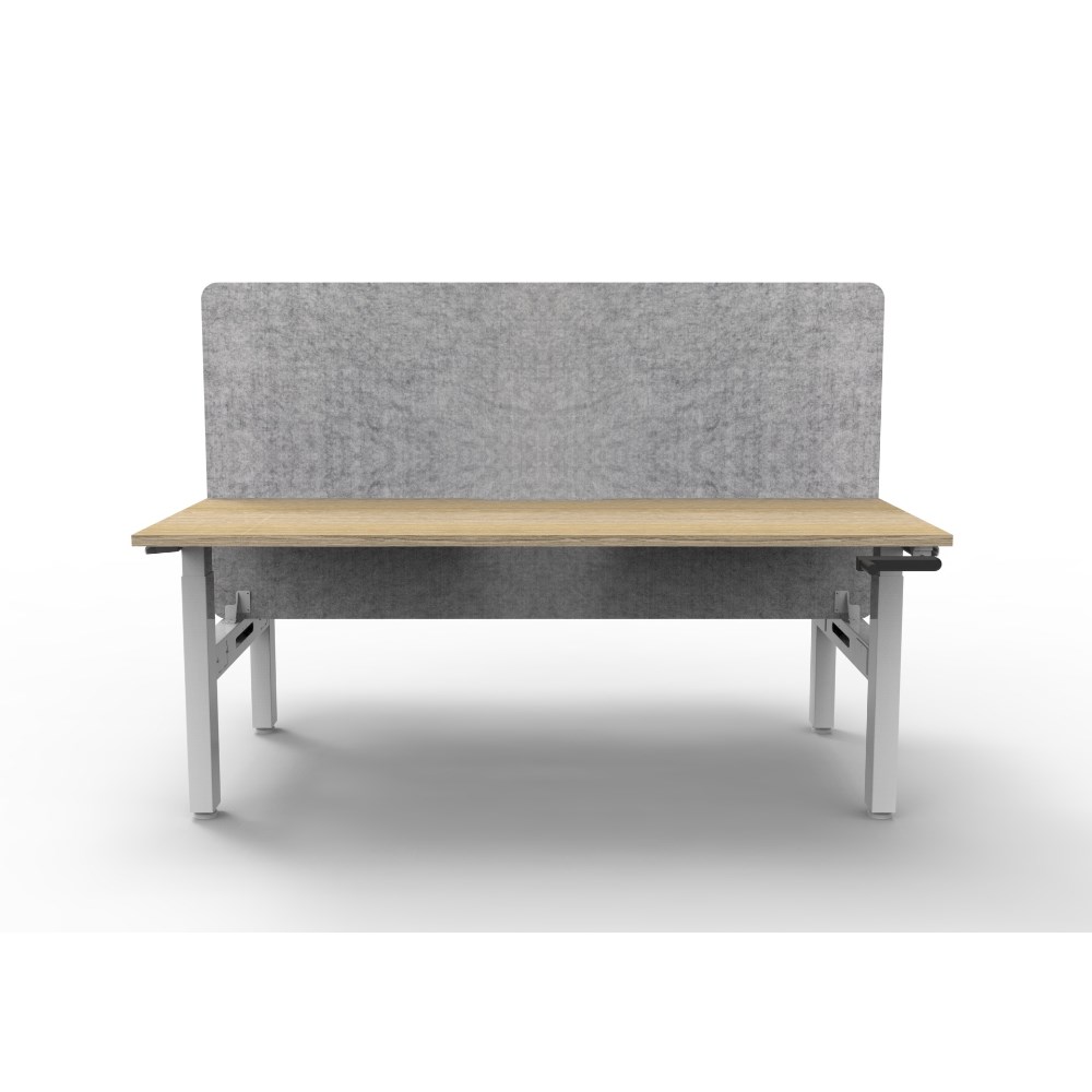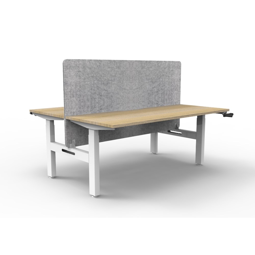 Manual crank height adjustable single sided workstation with Natural Oak top and White Satin frame, Grey Eco screen.