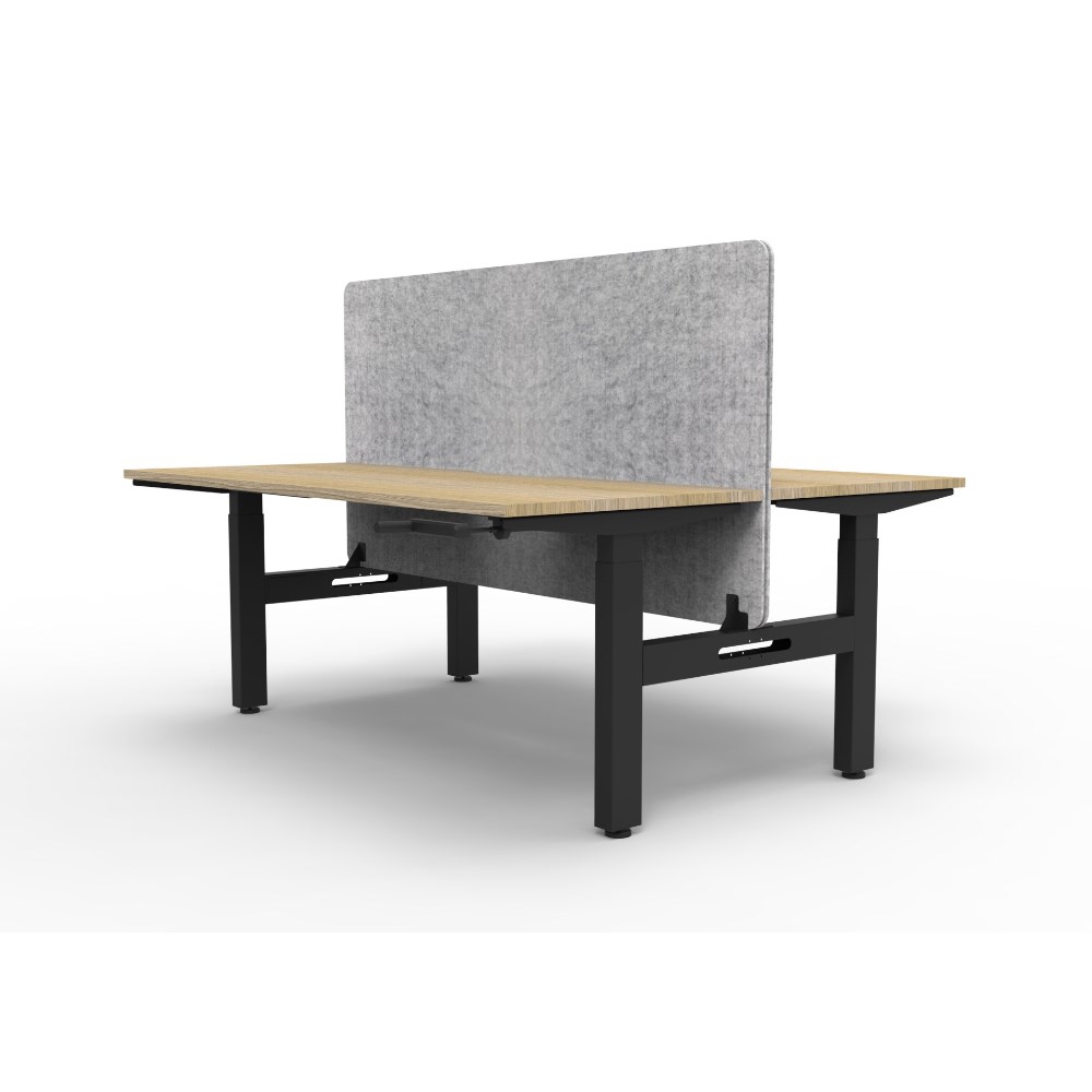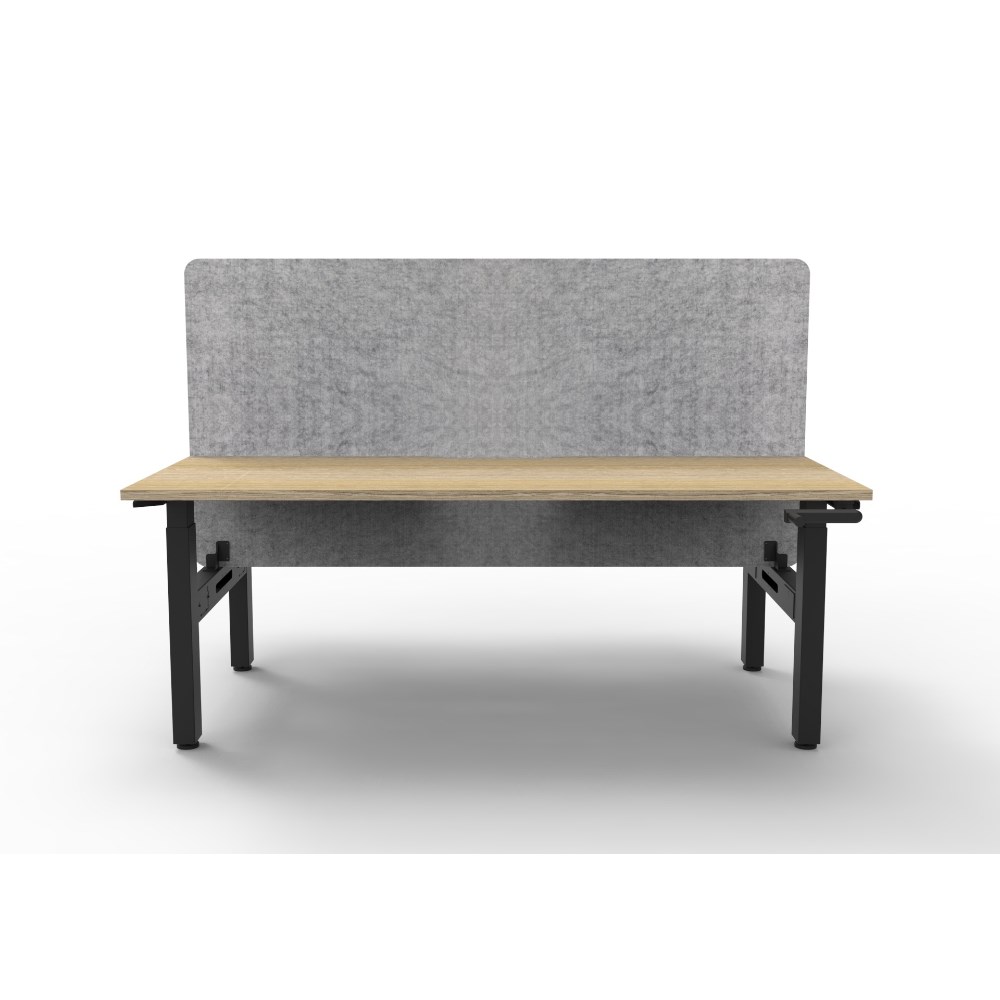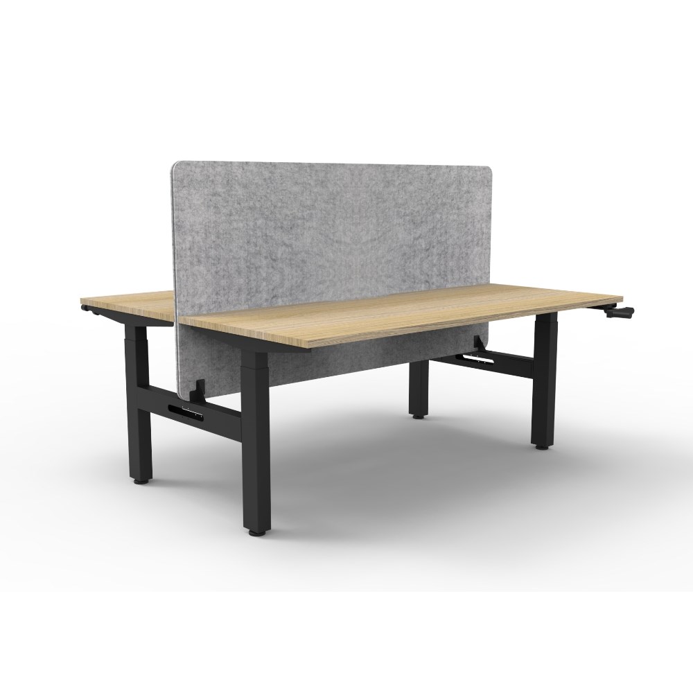 Manual crank height adjustable 2 person back to back workstation with Natural Oak top and Black Satin frame, Grey Eco screen.