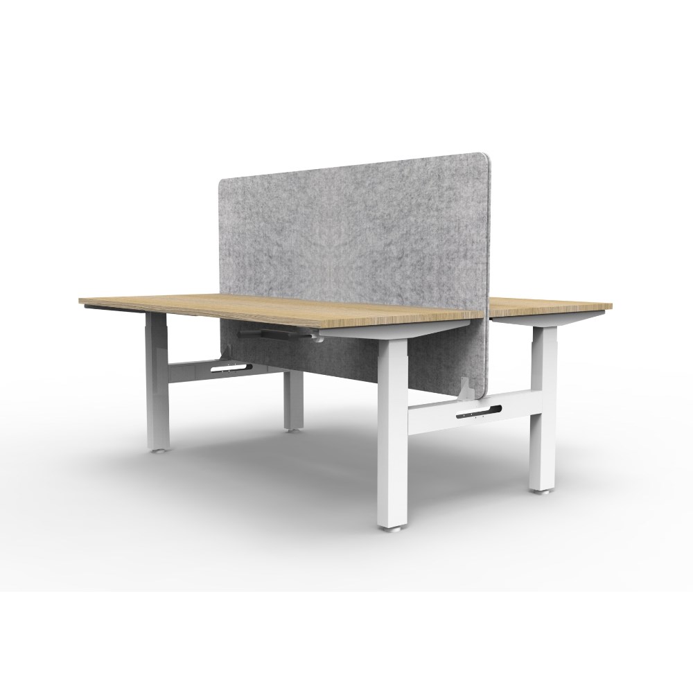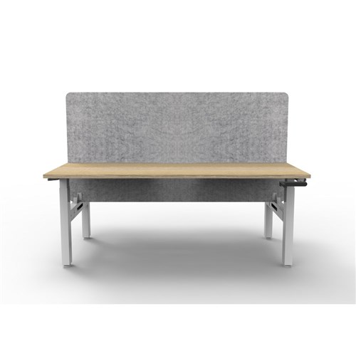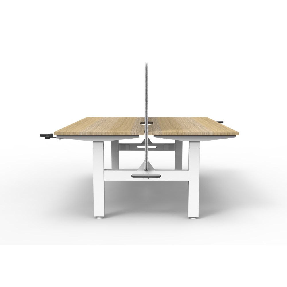 Manual crank height adjustable 2 person back to back workstation with Natural Oak top and White Satin frame, Grey Eco screen.
