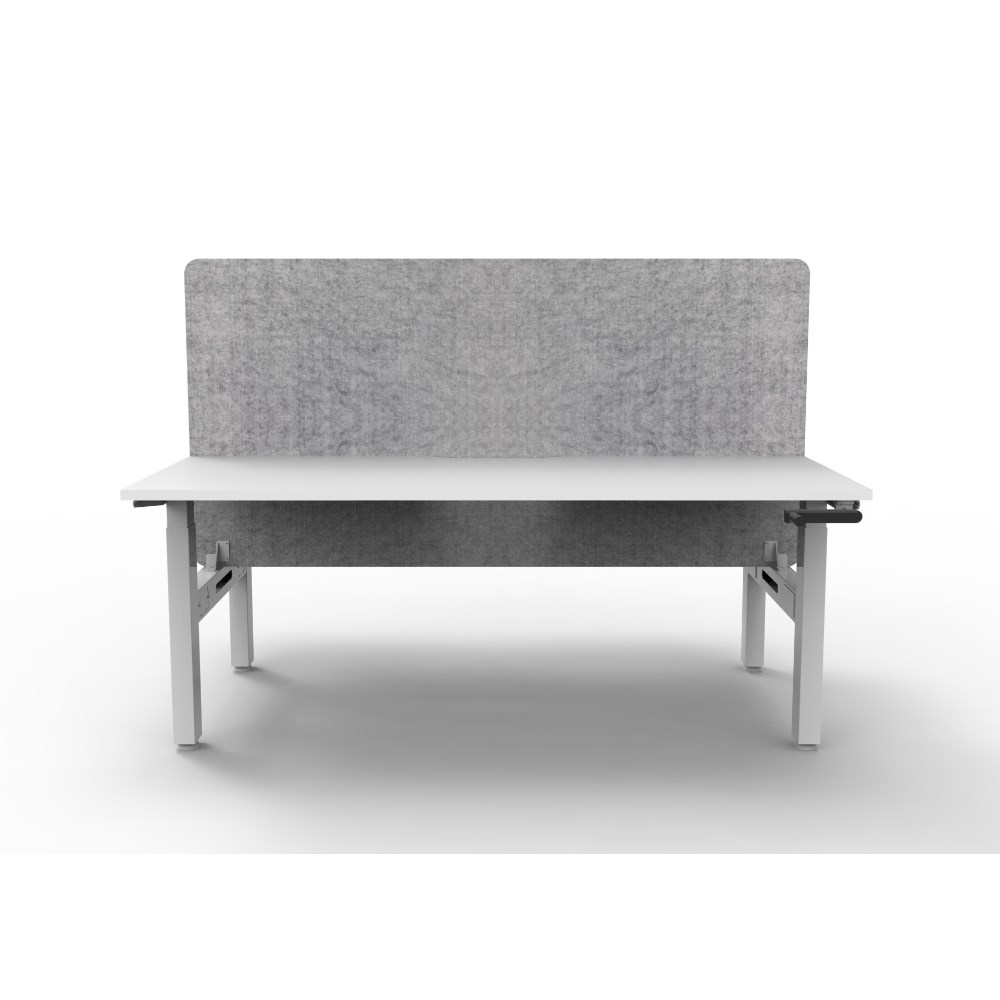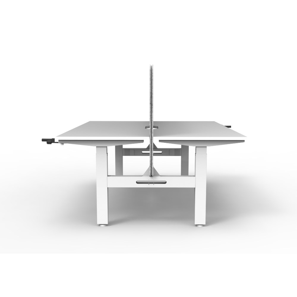 Manual crank height adjustable 2 person back to back workstation with Natural White top and White Satin frame, Grey Eco screen.