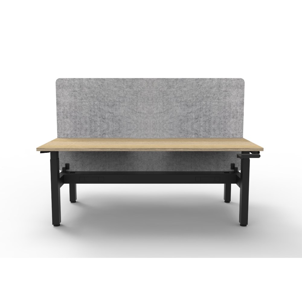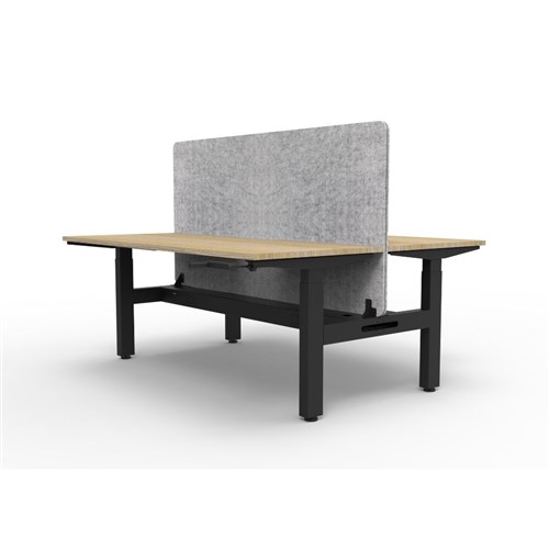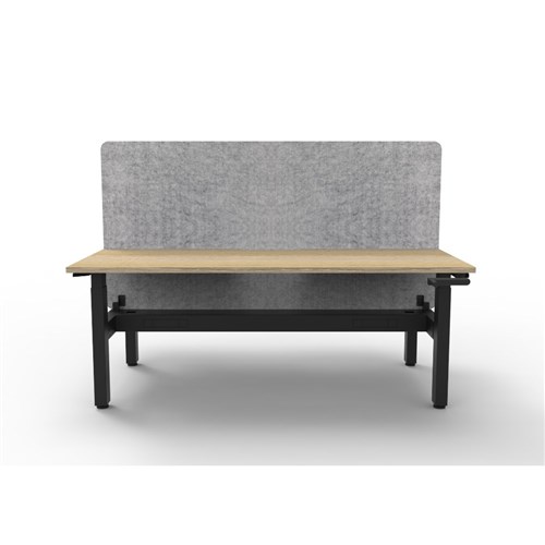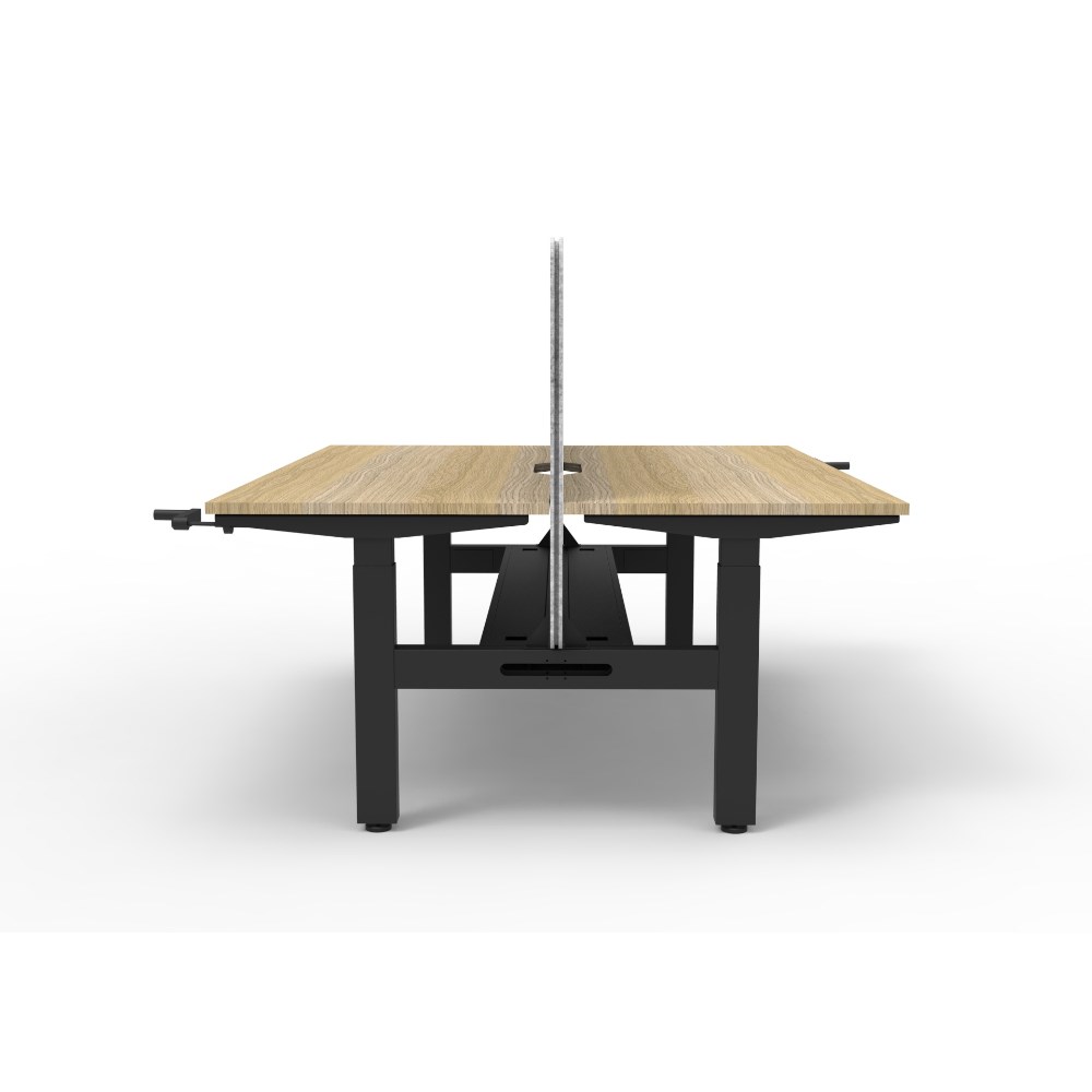 Manual crank height adjustable 2 person back to back workstation with Natural Oak top and Black Satin frame, Grey Eco screen and cable tray.