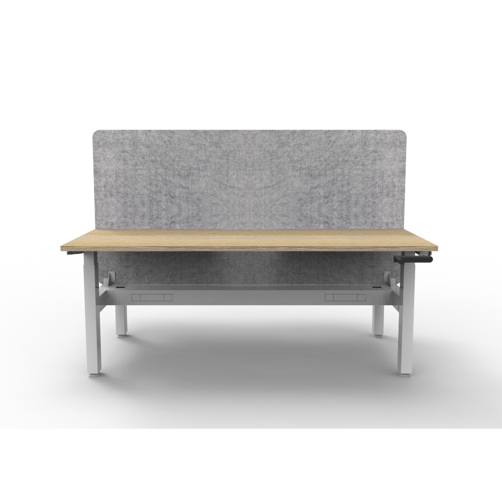 Manual crank height adjustable 2 person back to back workstation with Natural Oak top and White Satin frame, Grey Eco screen and cable tray.