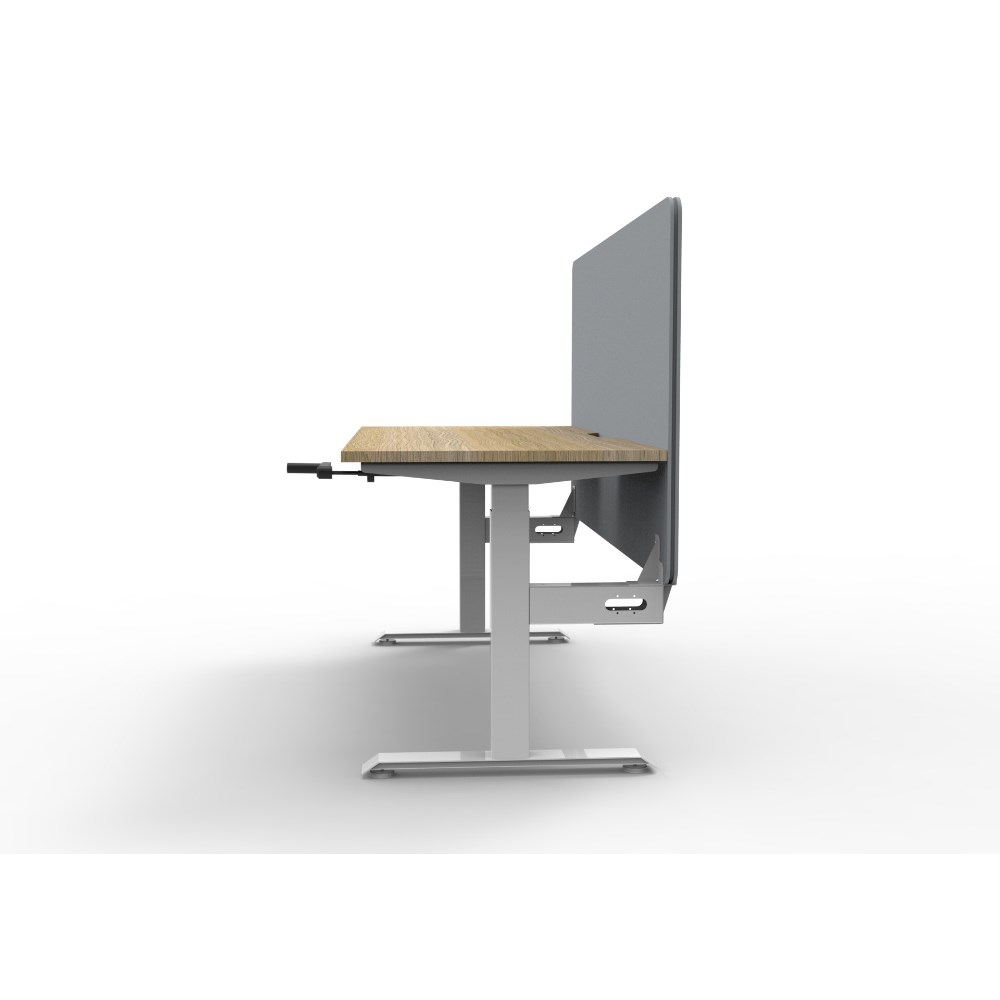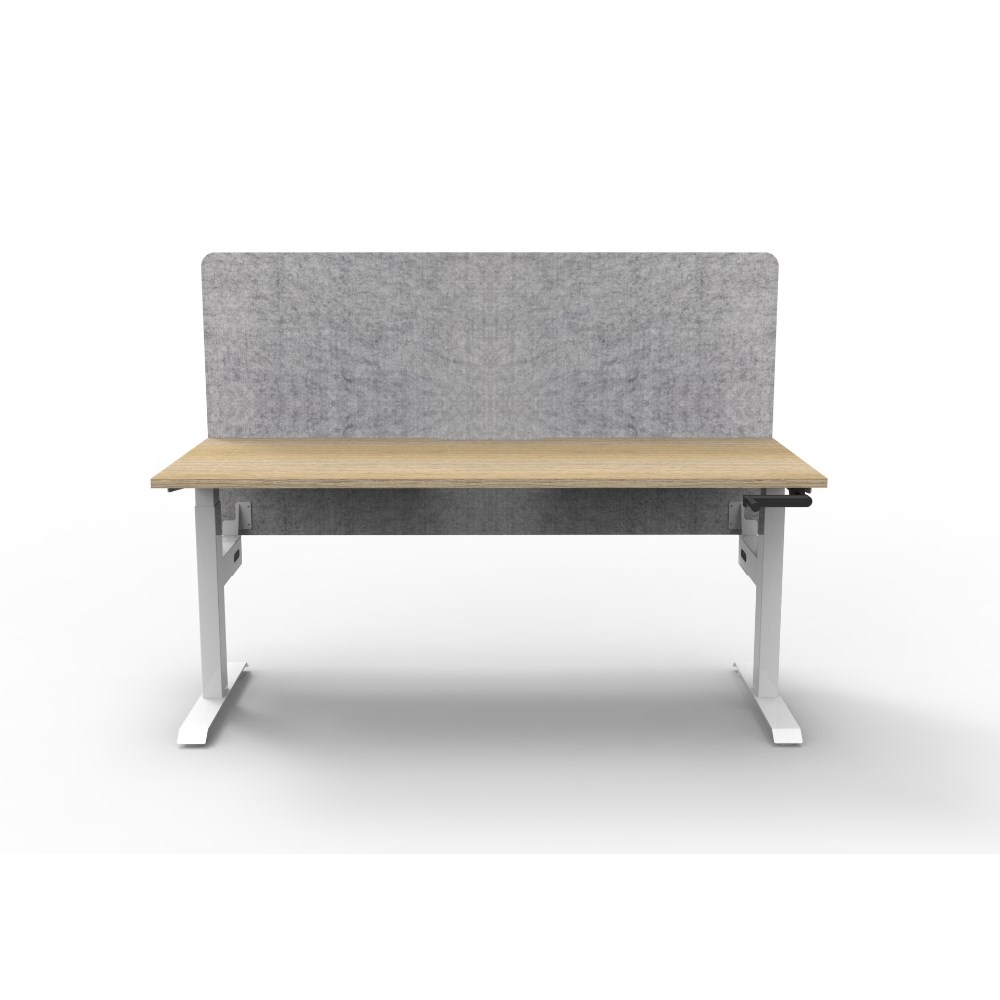 Manual crank height adjustable single sided workstation with Natural Oak top and White Satin frame, Grey Eco screen.