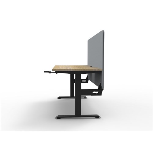 Manual crank height adjustable single sided workstation with Natural Oak top and Black Satin frame, Grey Eco screen.