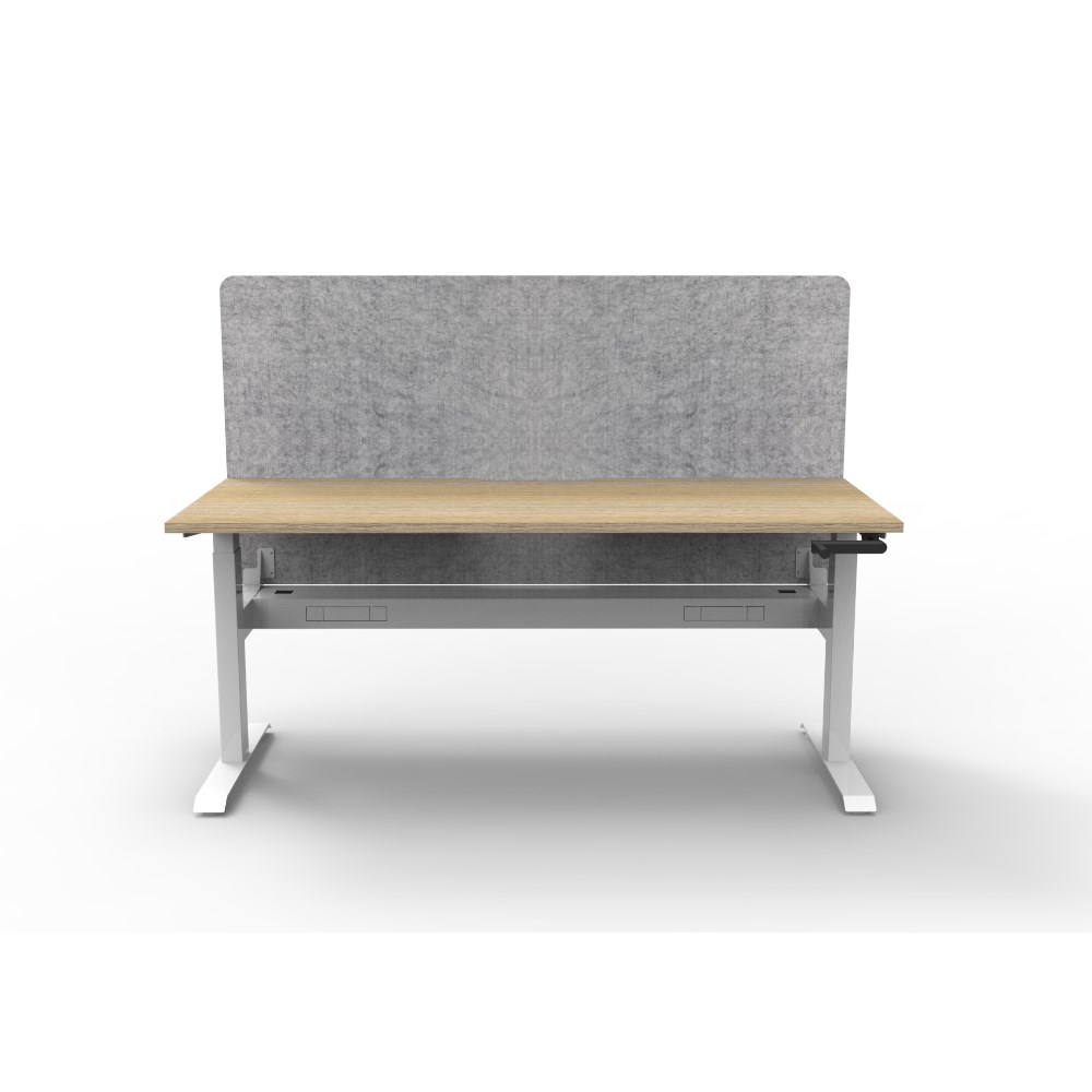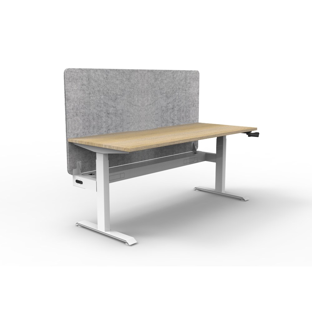 Manual crank height adjustable single sided workstation with Natural Oak top and White Satin frame, Grey Eco screen and cable tray.