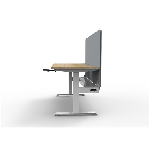Manual crank height adjustable single sided workstation with Natural Oak top and White Satin frame, Grey Eco screen and cable tray.