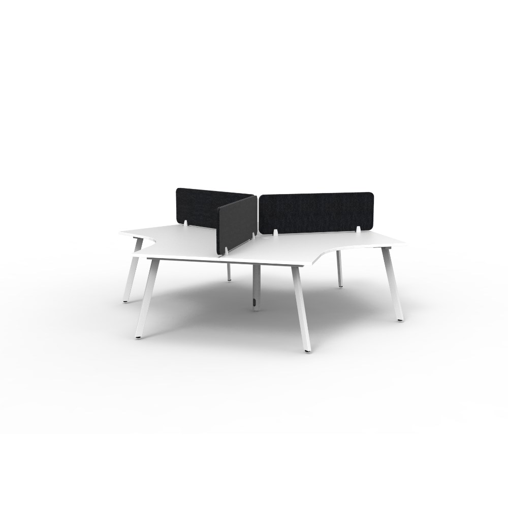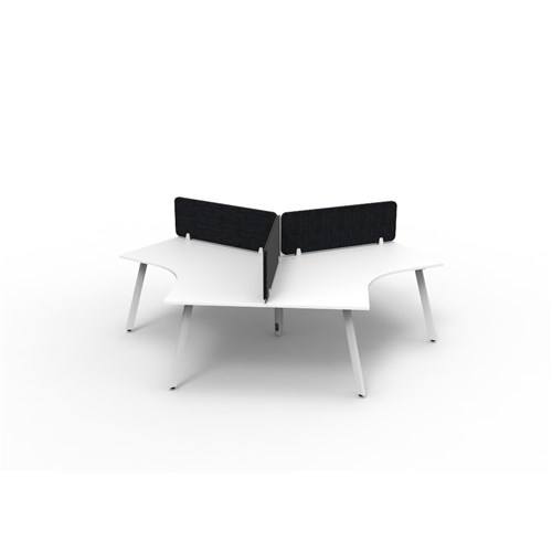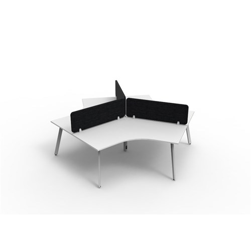 3 person 120 degree workstation with Natural White top and White Satin frame, Black Eco screen.