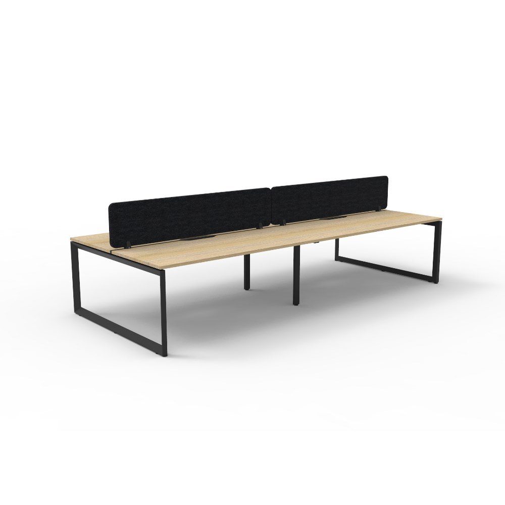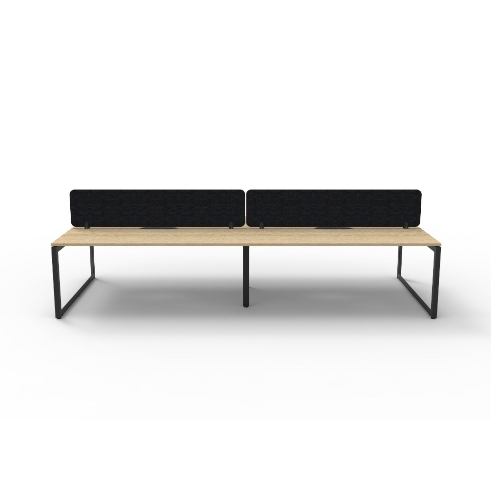 4 person double sided workstation with Natural Oak top and Black Satin frame, Black Eco screen.