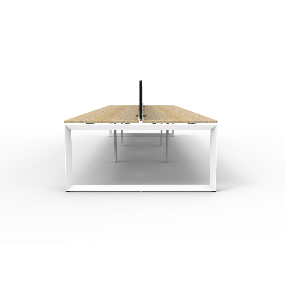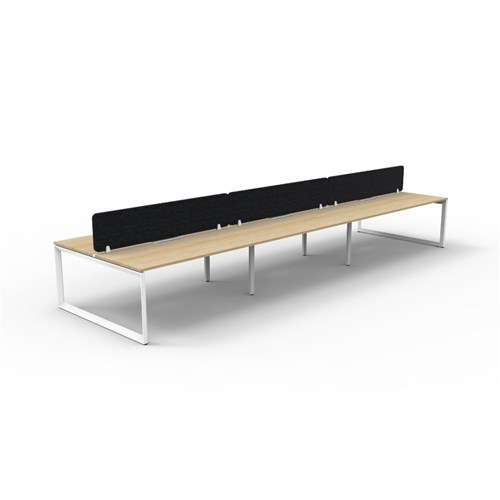 6 person double sided workstation with Natural Oak top and White Satin frame, Black Eco screen.
