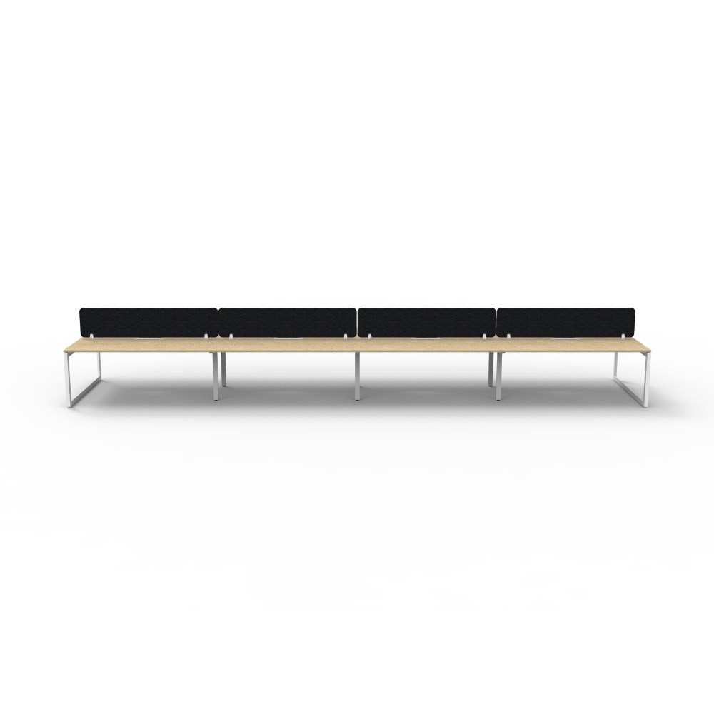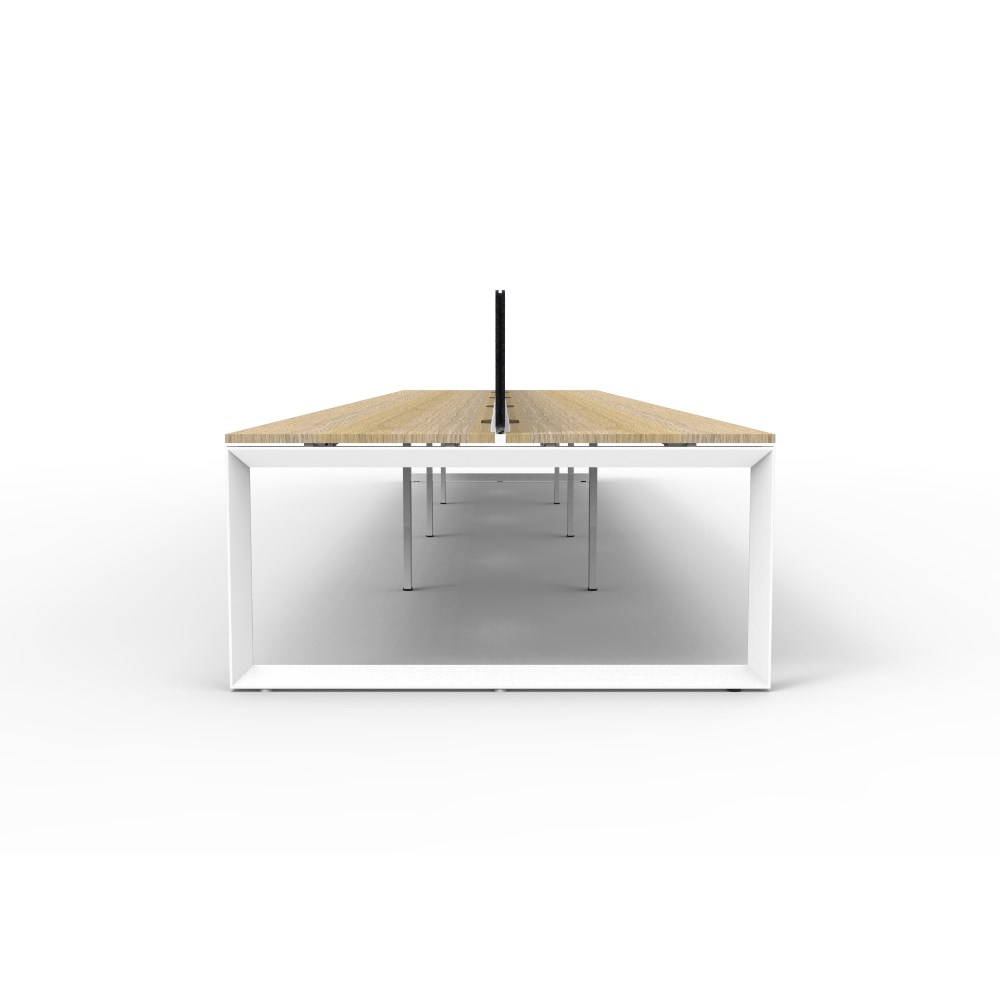 8 person double sided workstation with Natural Oak top and White Satin frame, Black Eco screen.