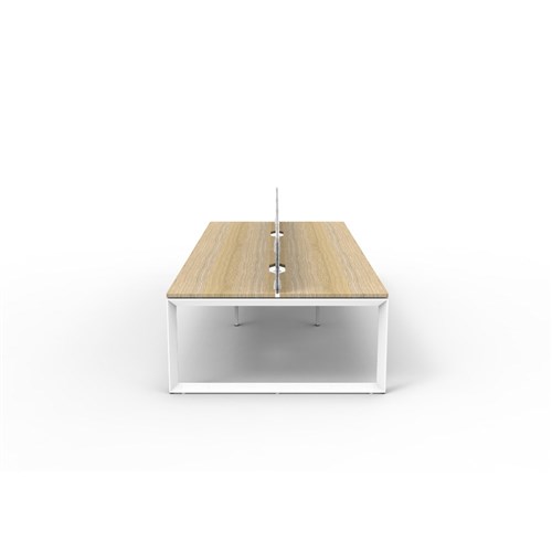 4 person double sided workstation with Natural Oak top and White Satin frame, Grey Eco screen.