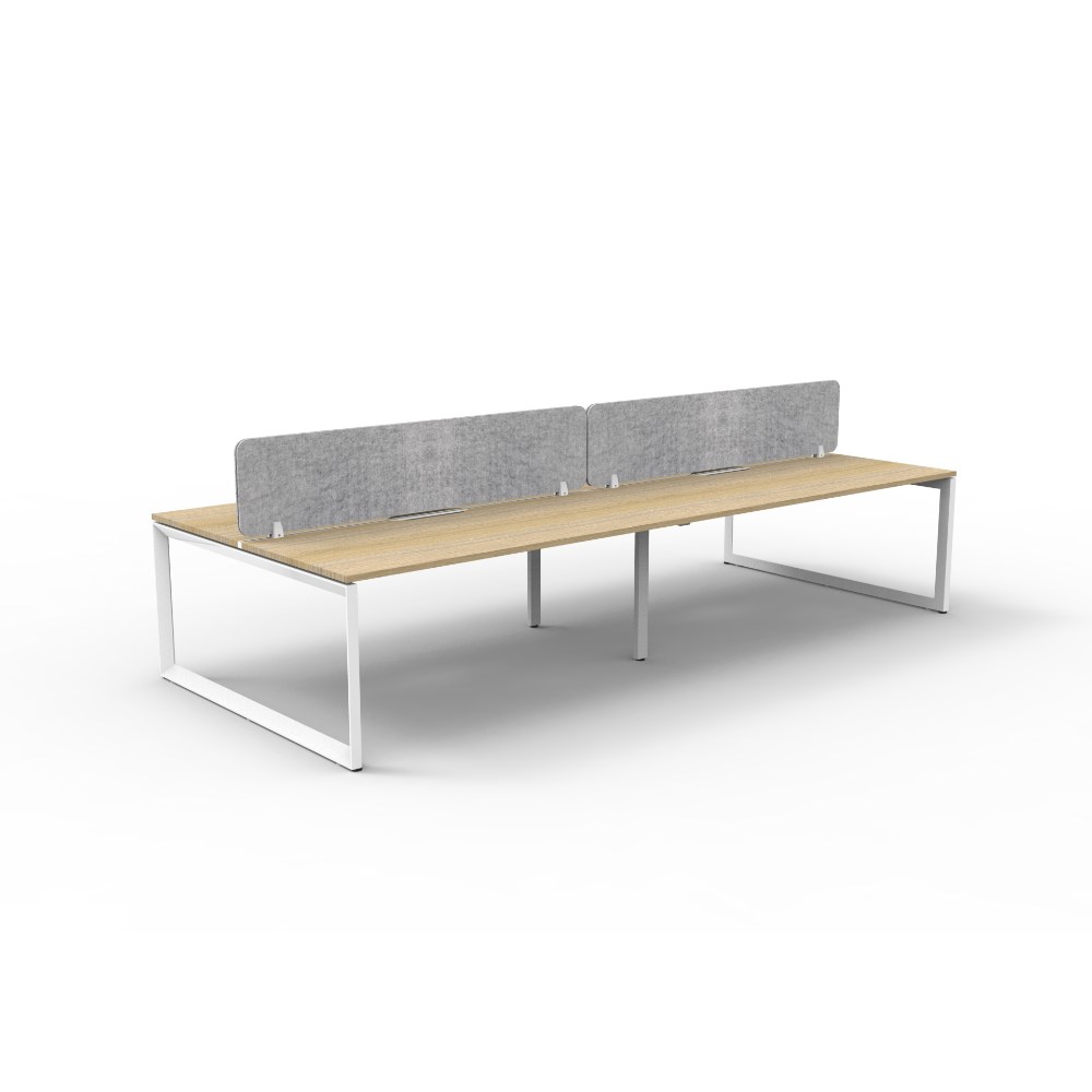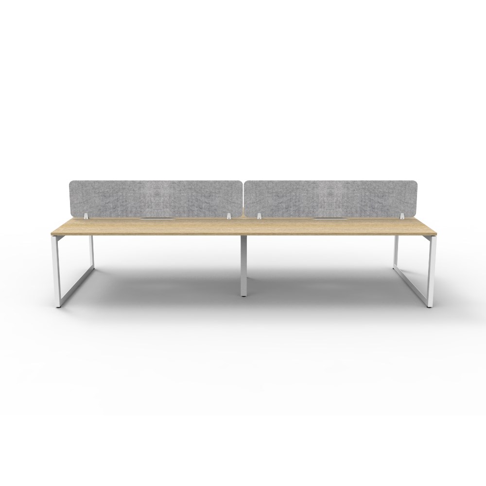4 person double sided workstation with Natural Oak top and White Satin frame, Grey Eco screen.