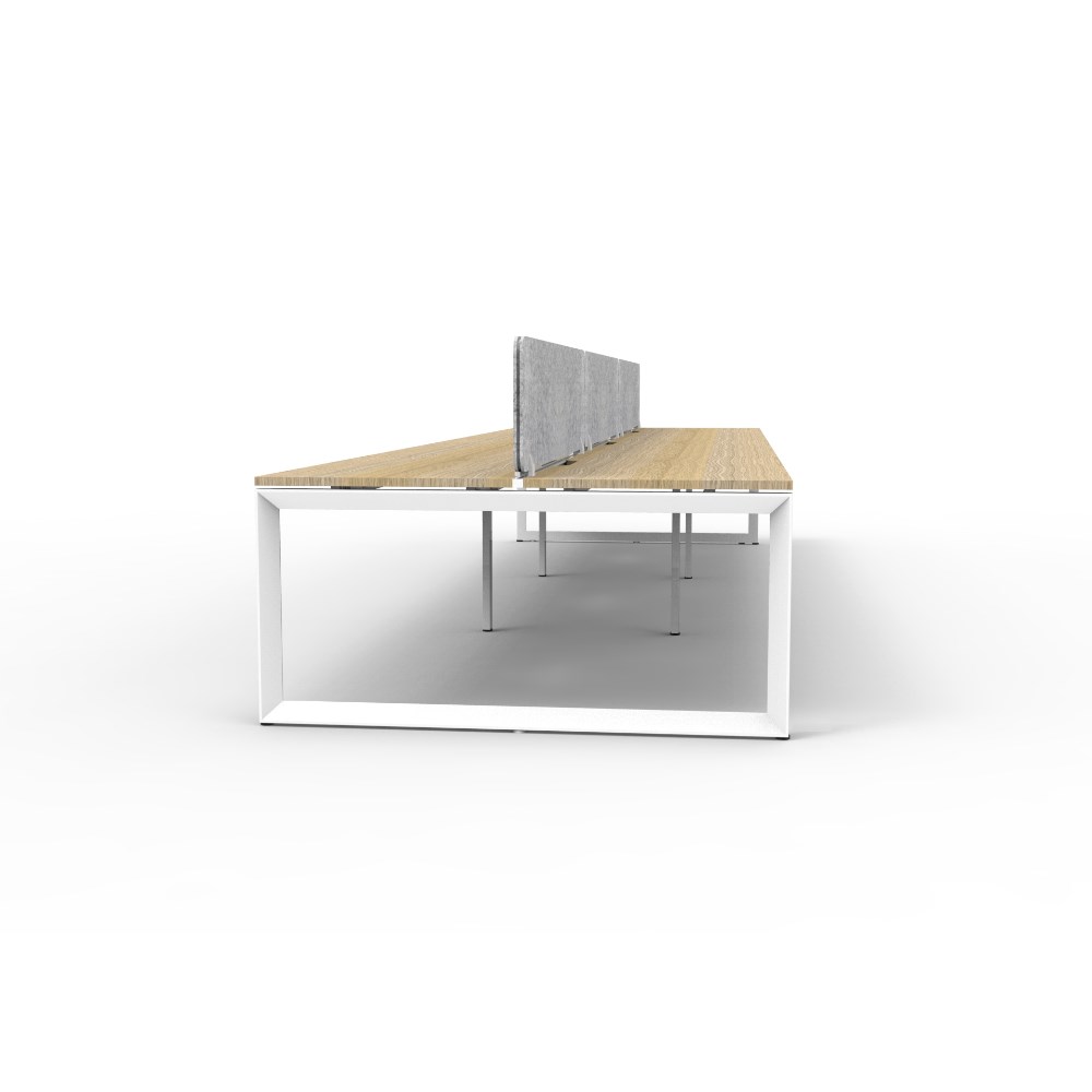 6 person double sided workstation with Natural Oak top and White Satin frame, Grey Eco screen.