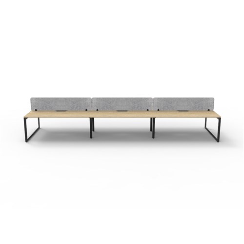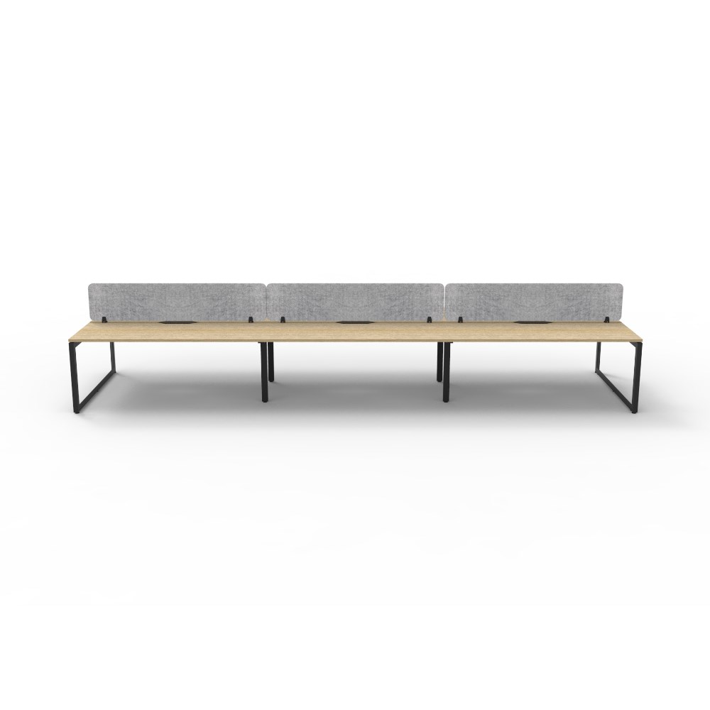 6 person double sided workstation with Natural Oak top and Black Satin frame, Grey Eco screen.