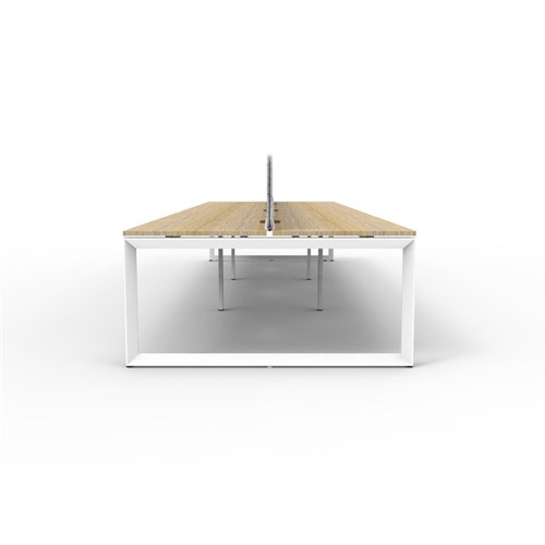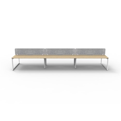 6 person double sided workstation with Natural Oak top and White Satin frame, Grey Eco screen.