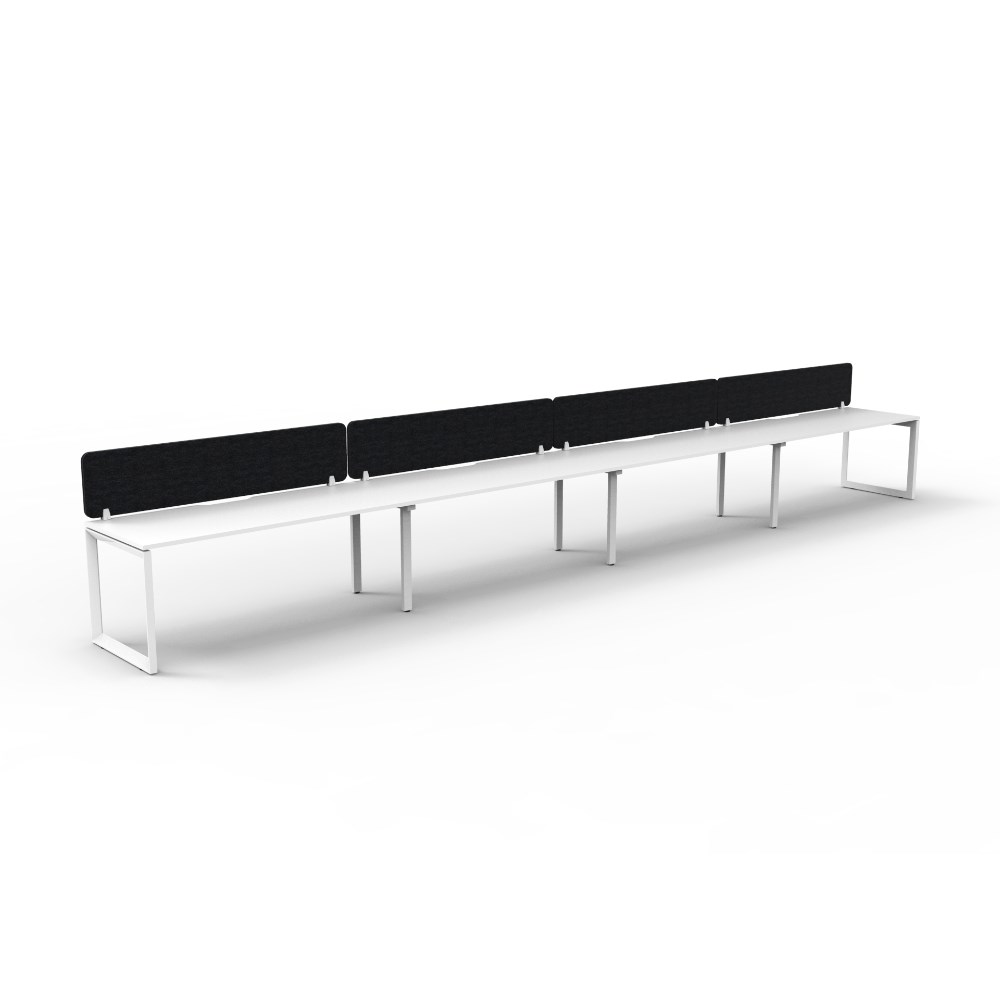 4 person single sided workstation with White top and White Satin frame, Black Eco screen.