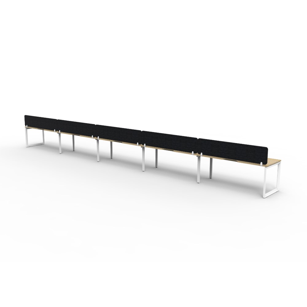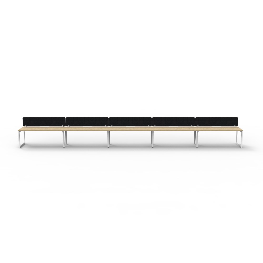 5 person single sided workstation with Natural Oak top and White Satin frame, Black Eco screen.